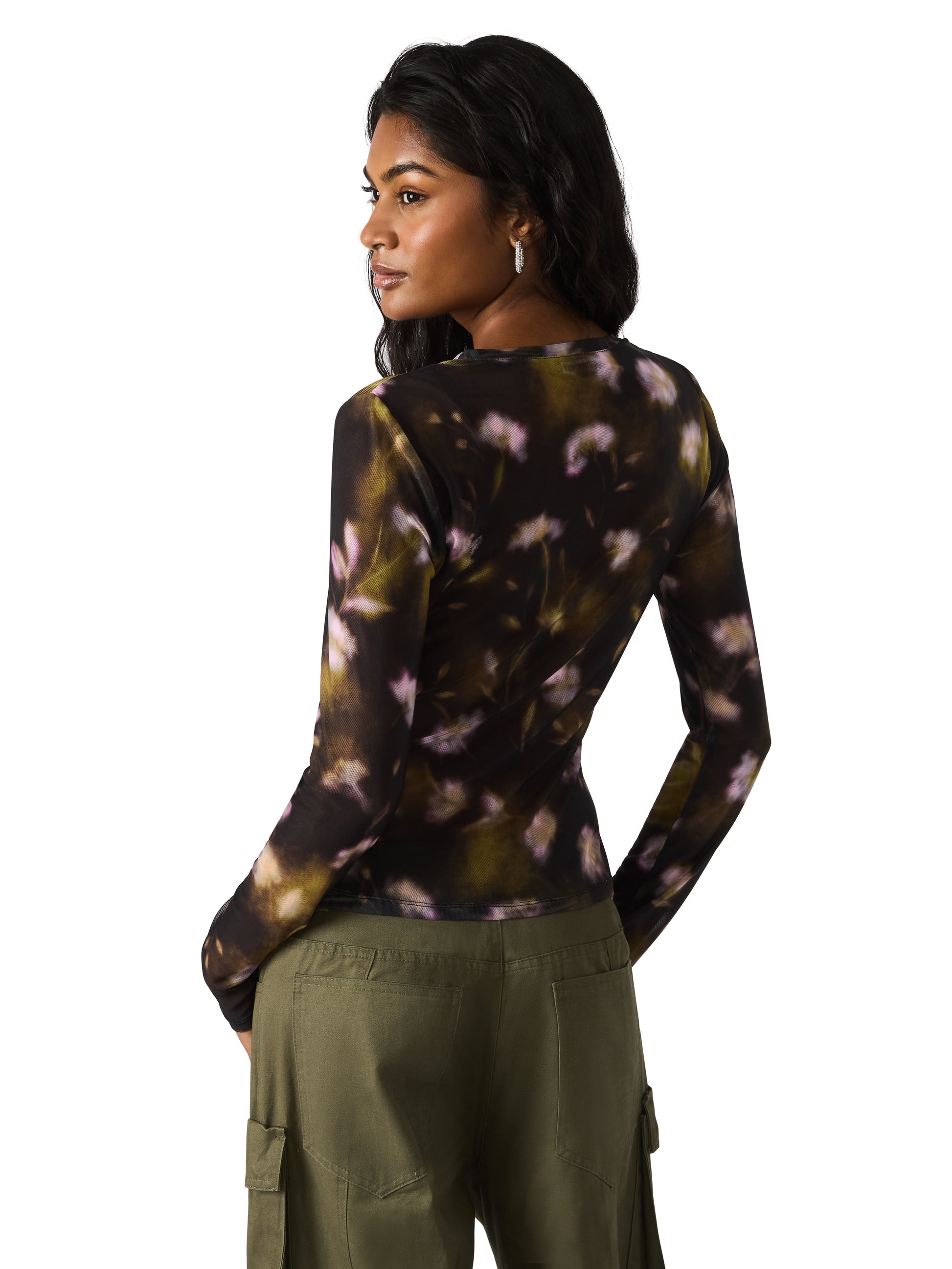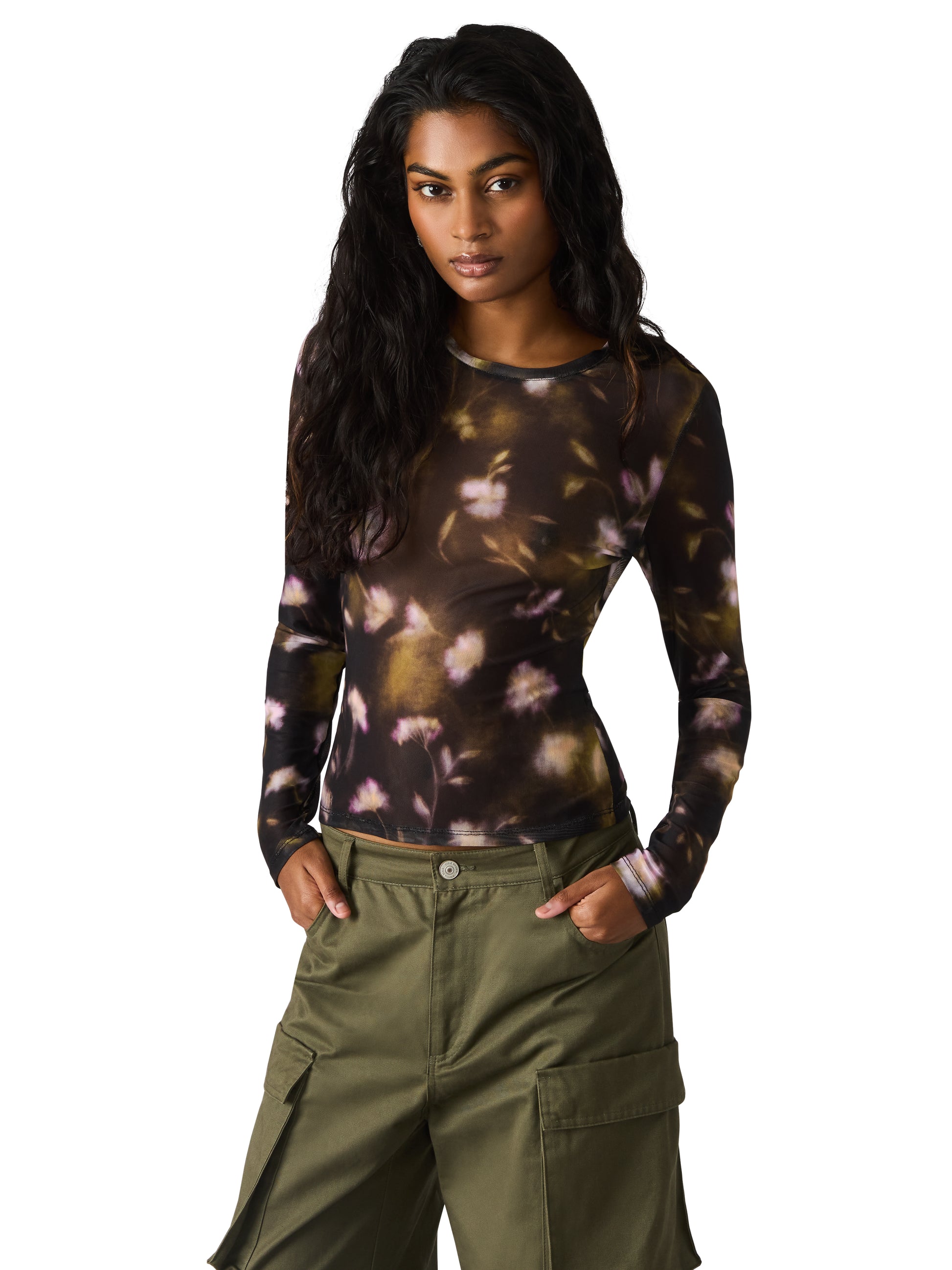 Introducing the Lilianna—a mesh top that's equal parts edgy and elegant. This crew neck long sleeve features a softly blurred floral print that peeks through the semi-sheer fabric, creating an effortlessly layered look without the extra piece. Perfect for adding dimension to your everyday style or dressing up for a night out. The lightweight mesh drapes beautifully and works solo or layered under your favorite basics. A versatile wardrobe essential that does the heavy lifting for you.