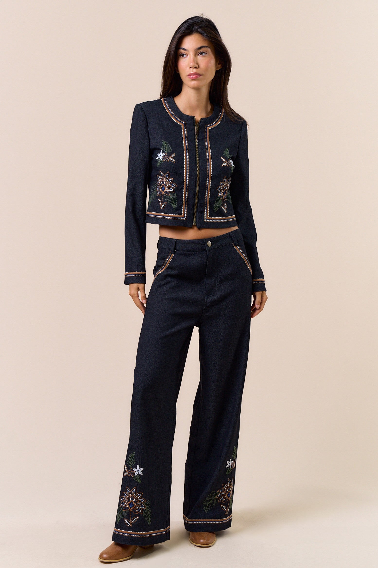 Crafted in a refined dark denim wash, the Luna Embroidered Jacket features split sleeves and a sleek zipper closure for a modern silhouette. Its lightweight fabric ensures comfortable wear, while delicate embroidered details add a subtle touch of elegance, making this piece perfect for a sophisticated, polished look.