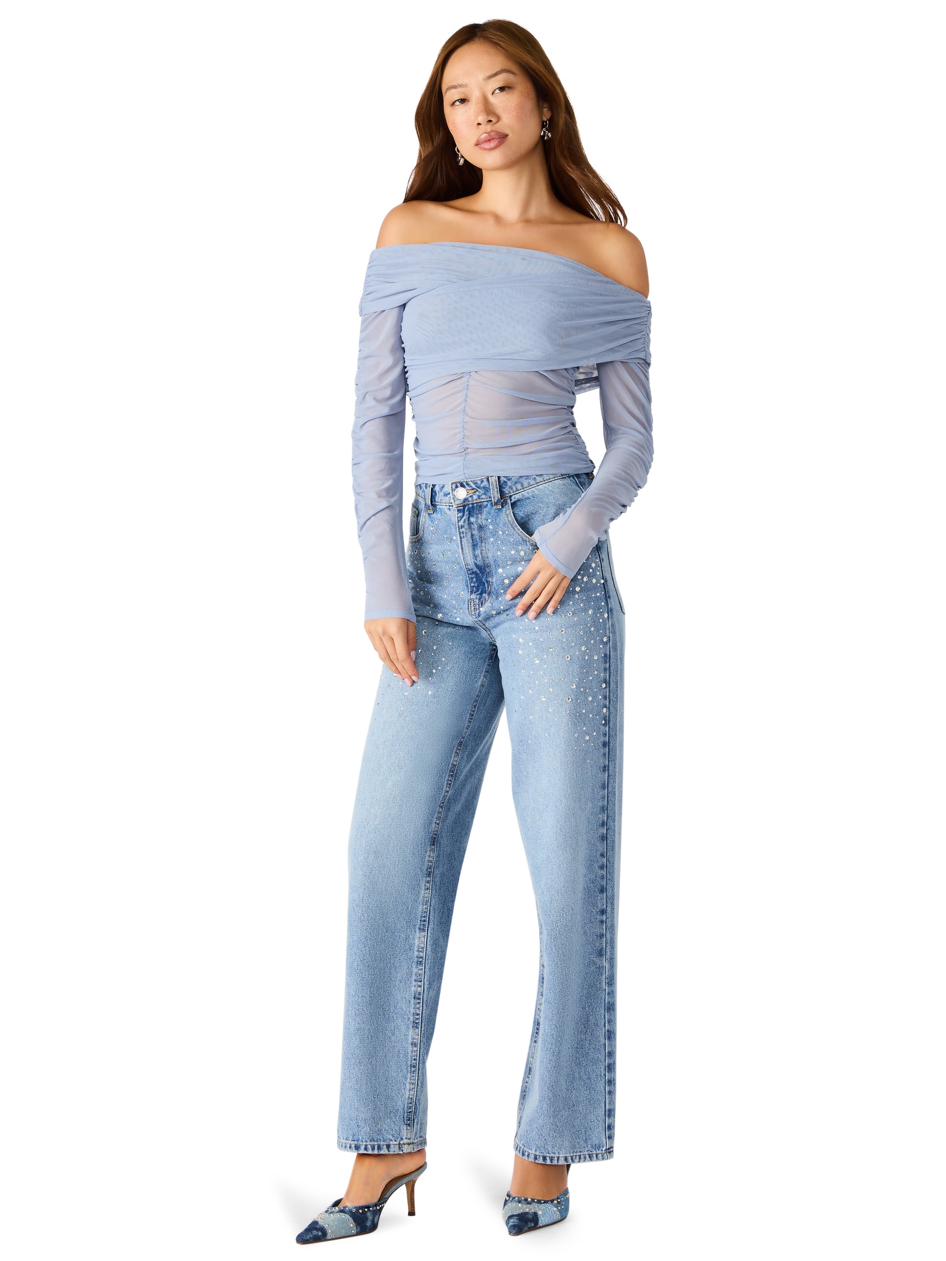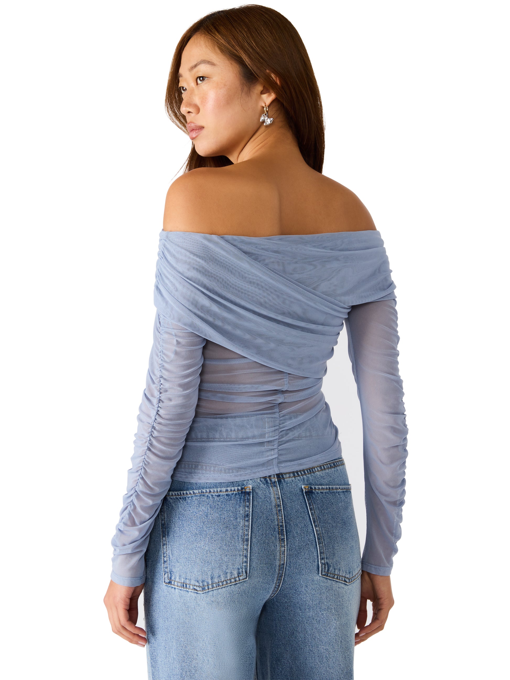 Effortlessly chic and undeniably flirty, the Viktoria Slate Top brings modern edge to your everyday rotation. Sheer mesh fabric drapes beautifully off the shoulder, while long sleeves feature playful ruching that adds dimension and movement. Perfect for layering over a slip or wearing solo for that bold, fashion-forward moment. Dress it up or down—this piece does it all.